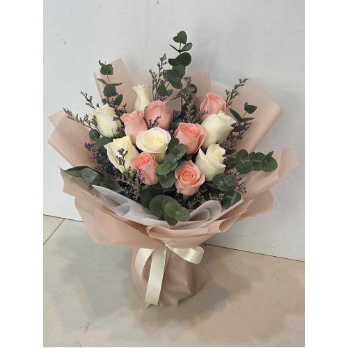 A soft, romantic, effortlessly elegant bouquet that brings together the gentle purity of white roses with sweet charm of sweet pink roses (total 9 stalks), all beautifully dressed in a peach frosted wrapper. The delicate hues create a graceful harmony, making it perfect for celebrating love, appreciation, or simply brightening someone’s day.
