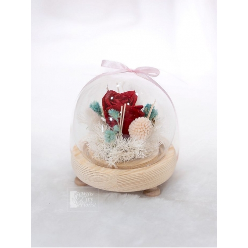 Bold, timeless, and deeply romantic, Eternal Red Poise features a stunning preserved red rose, surrounded by a graceful medley of assorted dried flowers, artfully arranged in soft, earthy tones. Encased in a crystal-clear round glass dome with LED light, this petite elegant piece captures the passion and depth of love that never fades.