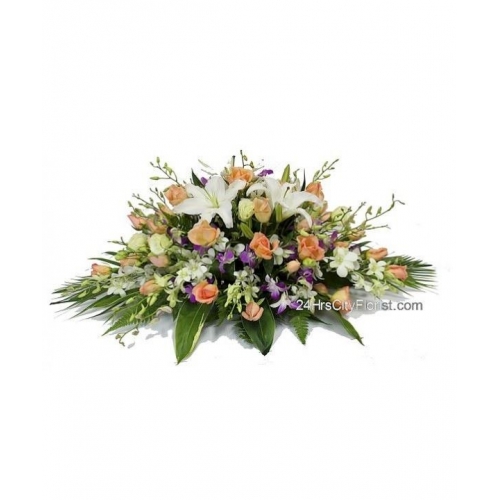 Table spray with this attractive blend of colours, champagne roses (20-24stalks) , white oriental lilies and purple orchids. Approx. length 60cm
