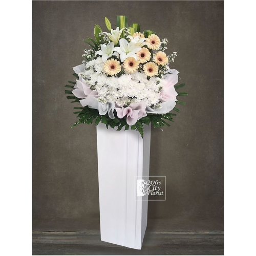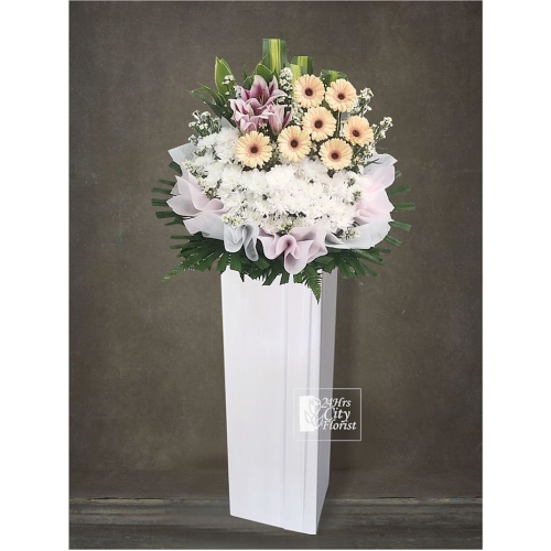 Soft and soothing stand that features elegant white/pink lilies paired with champagne gerberas, wrapped in delicate pink hues. A gentle expression of comfort and remembrance – perfect for conveying heartfelt sympathy with grace and warmth. Approx. 1.7m tall.