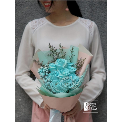 Synonymous with timeless elegance and sophistication, the spectacular Tiffany Blue color scheme perfectly enhances the beauty of this elegantly arranged Tiffany blue rose (9 stalk) comes with sandy pink wrapper bouquet. A stunning rendition of a perfect romantic date, a birthday surprise, or just to set that special someone’s heart racing!